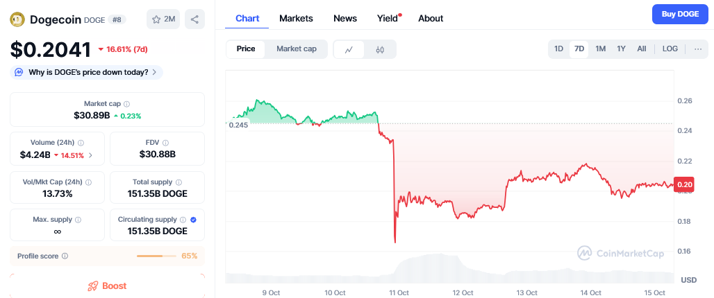 As of October 14, DOGE’s value stands at $0.2041 following a 16.61% drop over the past week.