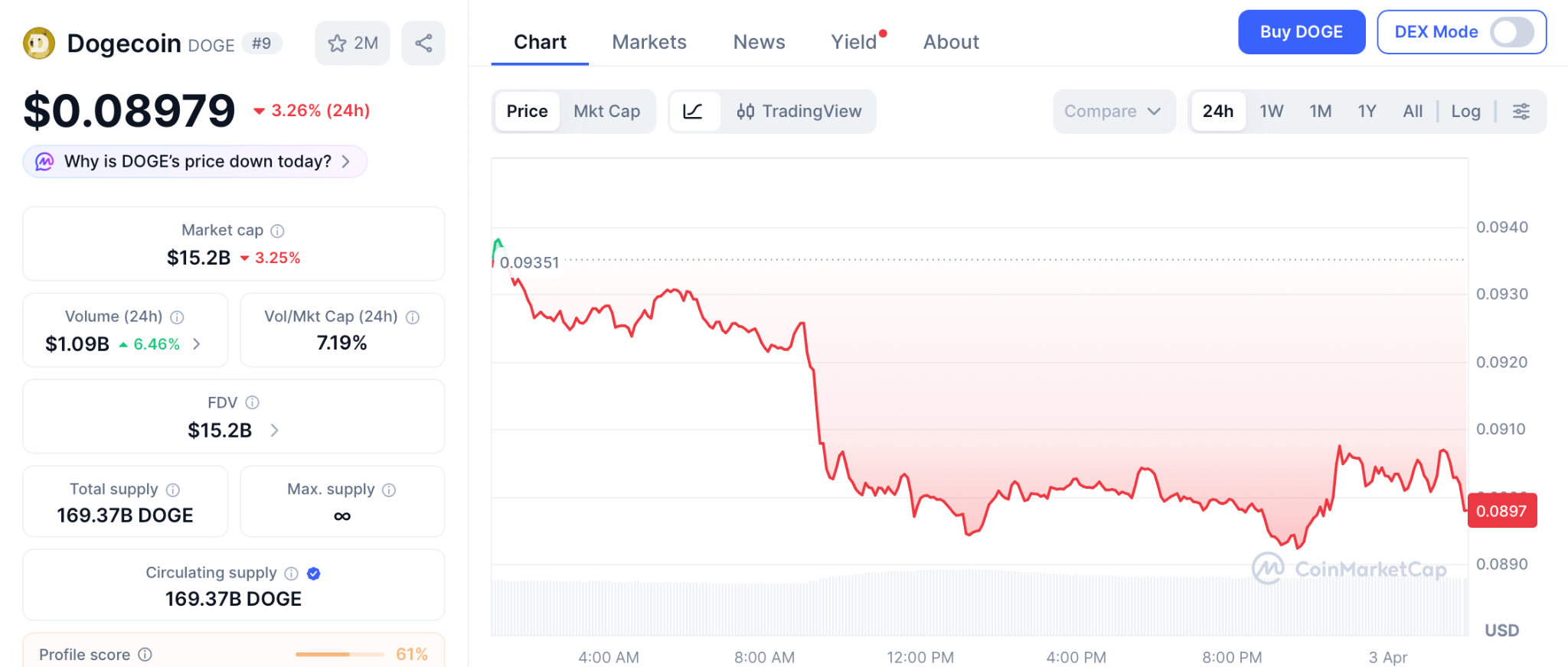 DOGE is trading near $0.089 and continues to hold above the $0.085 support that has been tested several times this quarter according to CoinMarketCap.