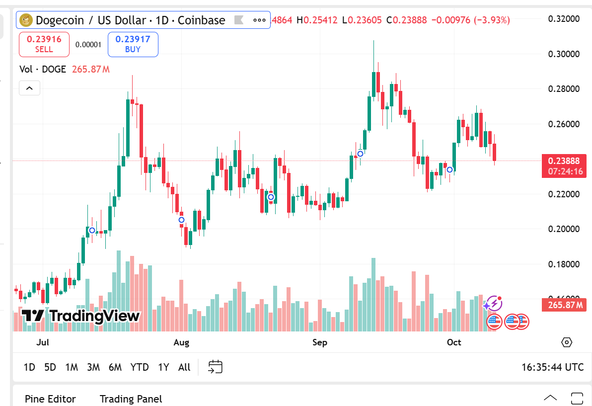 Dogecoin is priced at $0.2391, having increased by 1.57% over the last 24 hours. The token carries a market cap of $37.56 billion on the strength of a trading volume of $3.04 billion, having declined by 4.85%. Dogecoin has a robust market presence despite short-term losses on the strength of liquidity and widespread usage in microtransactions and tipping throughout the internet.