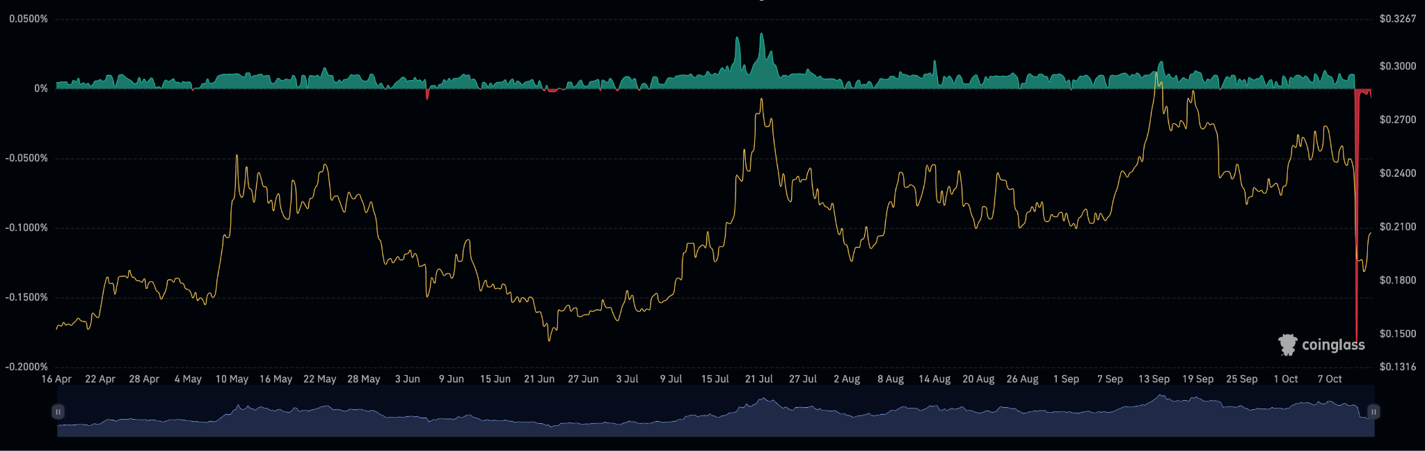 Friday’s flash crash wiped out about $3.2 billion in leveraged Dogecoin positions, most of which were longs. This caused the asset’s funding rates to plummet from 0.1% to -0.18%, meaning that traders who held a long position in DOGE would receive payments from short sellers to keep their positions open.