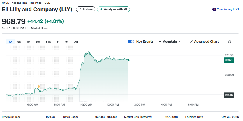Eli Lilly and Company (NYSE: LLY) opened the trading week with a strong surge, as shares climbed roughly 5% intraday on Monday, trading near $981, approaching record territory.