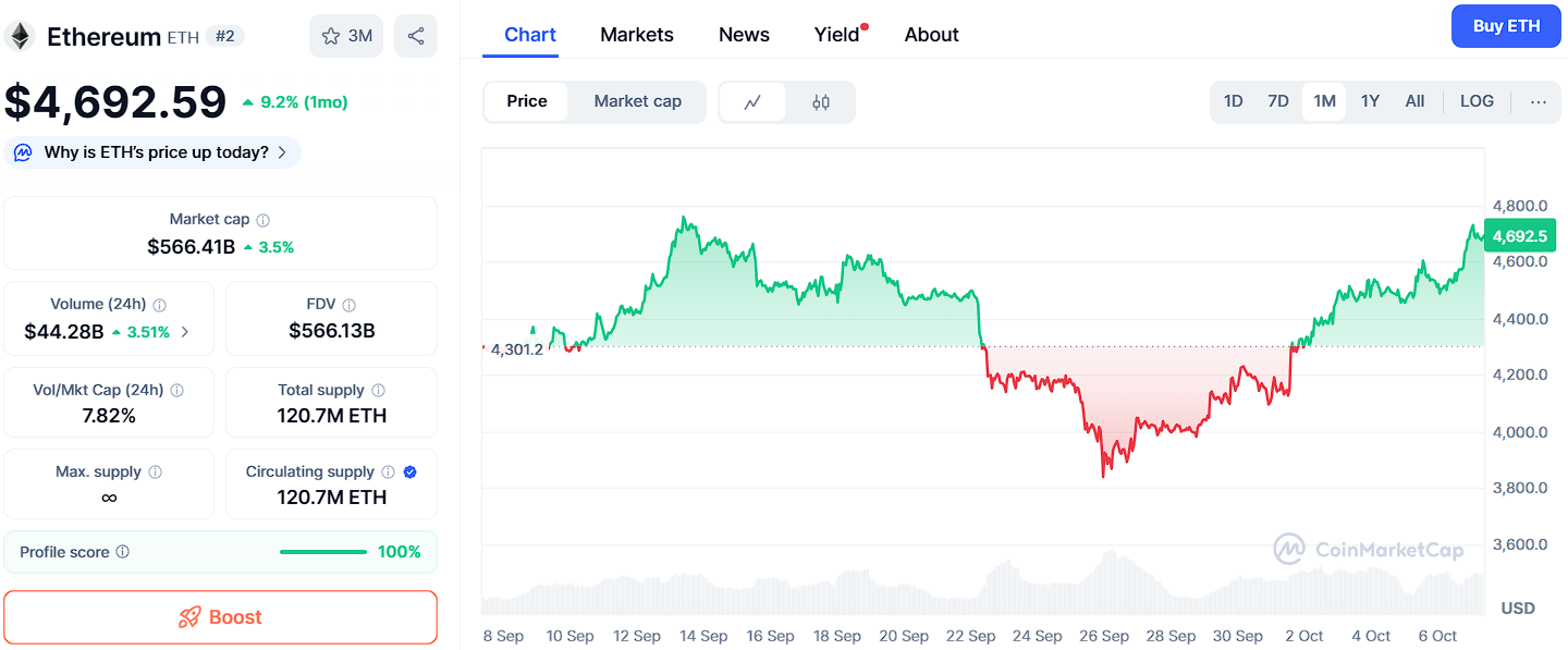Ethereum (ETH) is preserving an effective uptrend, currently trading at $4,692, fueled by rising DeFi interest, growing institutional demand, and the continued success of its Layer-2 ecosystem. Ethereum remains the foundational layer of Web3 innovation, serving as the backbone for decentralized finance, NFTs, and real-world asset tokenization.