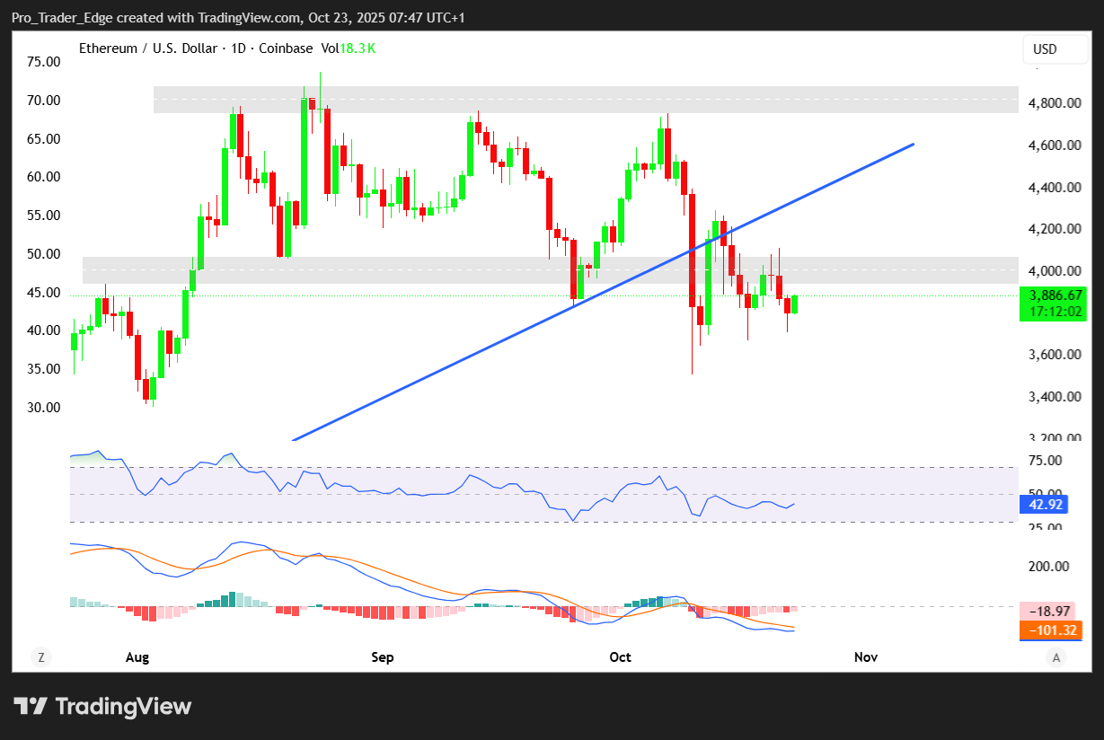 Ethereum recently attempted to break through a major resistance area but failed. Ted noted that ETH retested this resistance level but could not hold above it. After the failed attempt, the token slid back toward the $3,800 region.