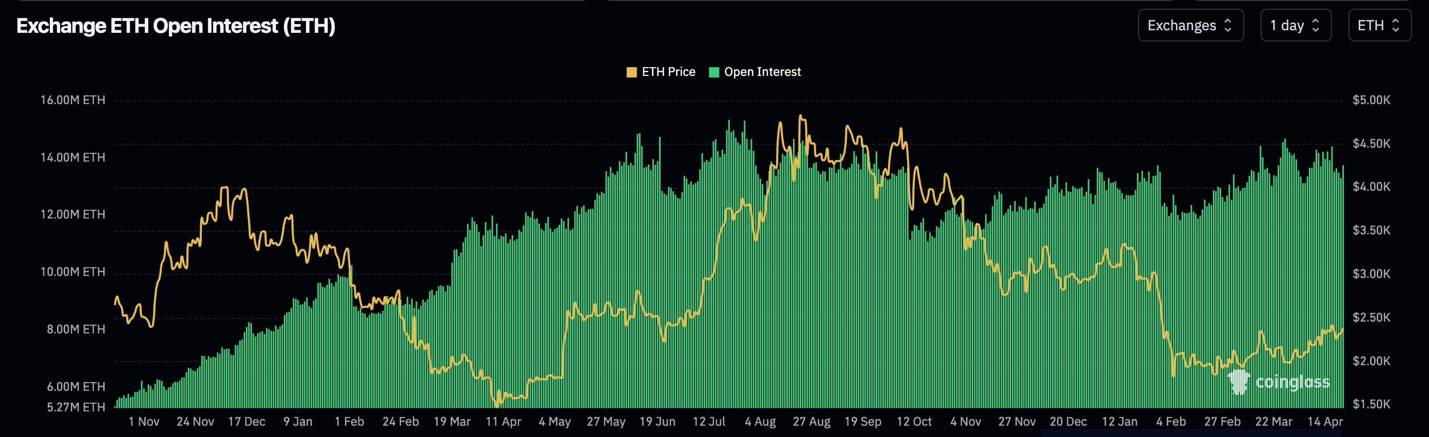 Open interest in ETH futures rose by 440,000 ETH in a short window. When measured in ETH terms, open interest has climbed back to levels seen in mid-2025. The all-time high sits about 6% above the current reading.