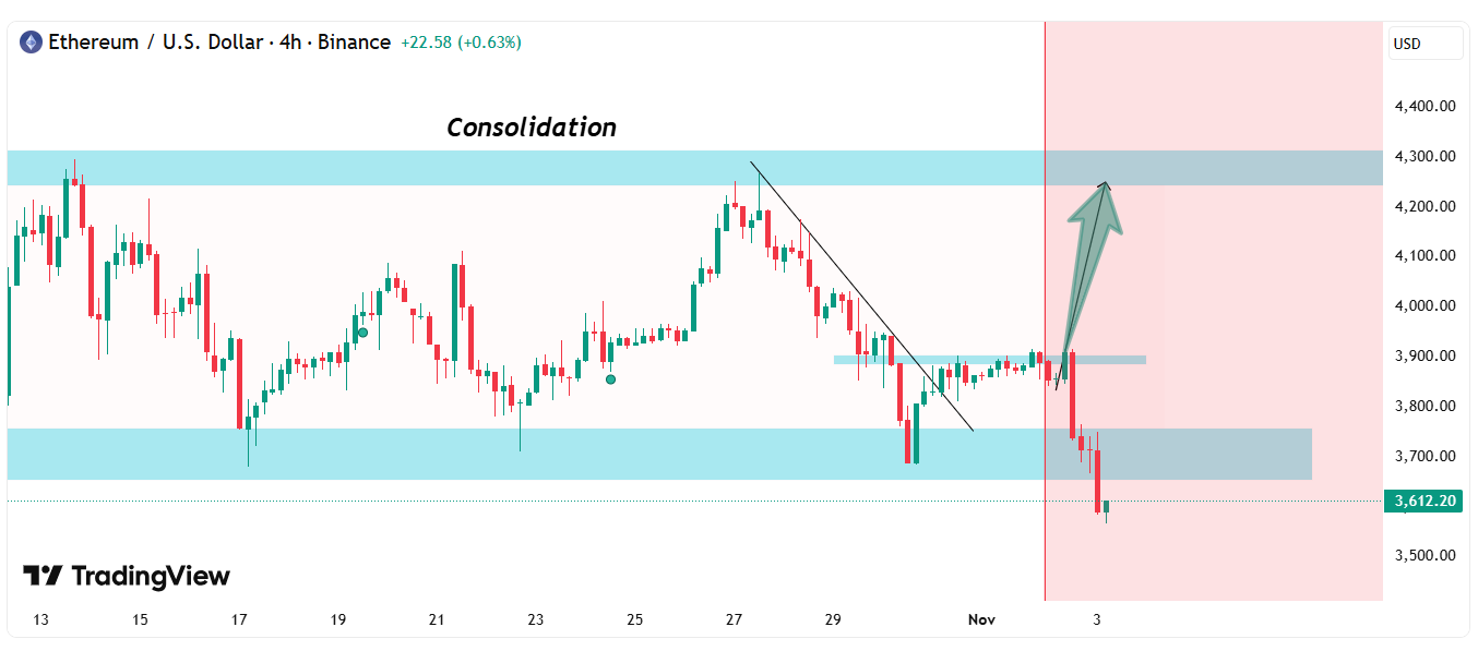 Ethereum could not hold $3,850 and slipped under $3,800, moving below its 100-hour SMA. Price action around a nearby band now shows a change of character, pointing to local buyer dominance returning. If that strength builds, the ETH price can drive toward the $4,250 range resistance.