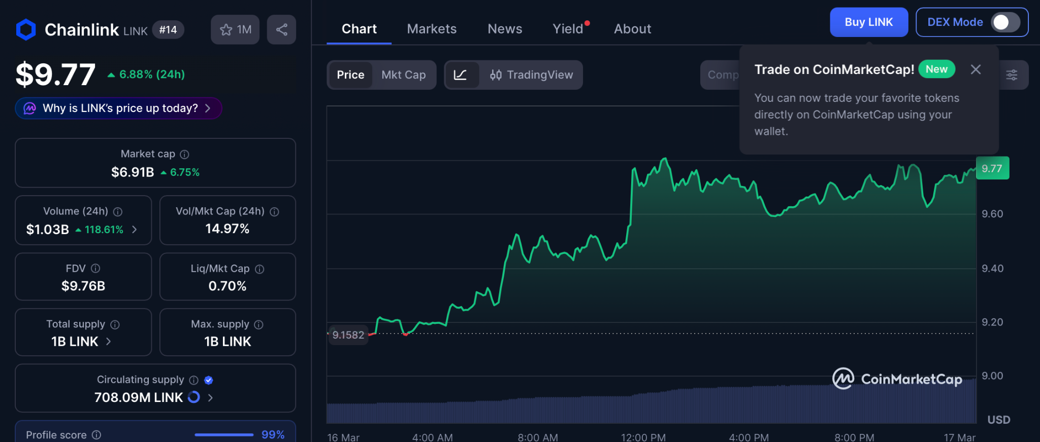 Chainlink trades near $9.77 with a neutral RSI of 41.97 according to CoinMarketCap. LINK is projected to reach $21.56 by end of 2026, roughly 140% return.