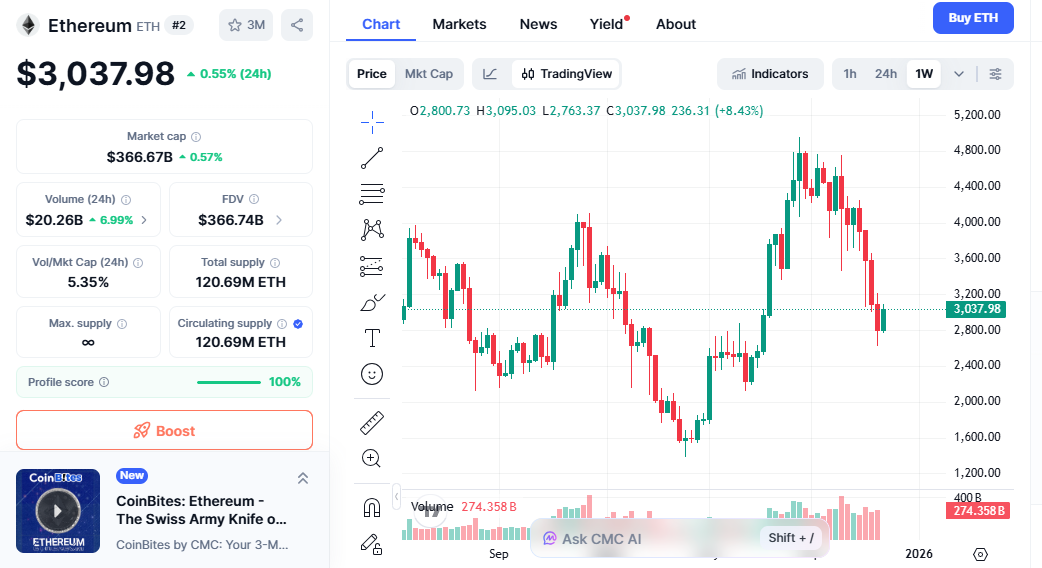 ETH currently trades around $3,037 on Nov 28 after consolidating from recent highs. But the technical and fundamental setup for 2026 looks increasingly bullish.