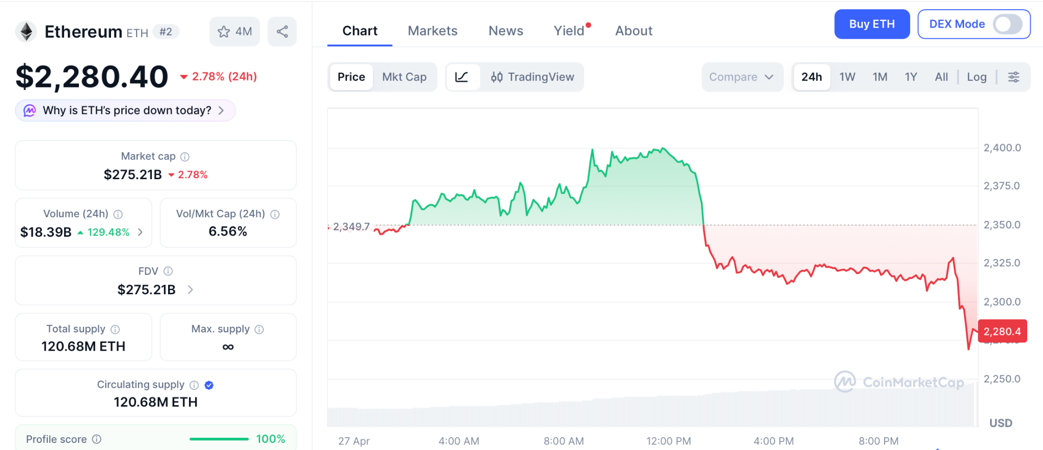 Ethereum (ETH) trades at $2,280 on April 27 according to CoinMarketCap, sitting 52.4% below its all-time high of $4,878 reached in November 2021. RSI at 55 shows neutral momentum, and the 200-day moving average sits near $2,310.