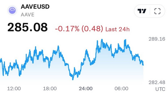 AAVE trades close to $285, with support at $282 and resistance at $310. A move above this zone may push the price toward $330-$350.Â