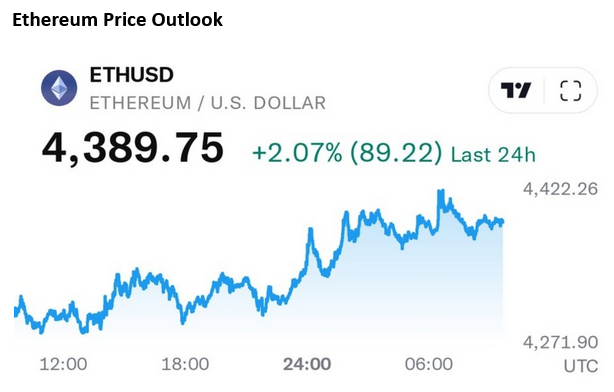Ethereum trades near $4,389 after a 2% daily gain. Support is holding at $4,270, with resistance forming near $4,420. If buyers can push past that zone, the price may test $4,700 to $5,000.Â