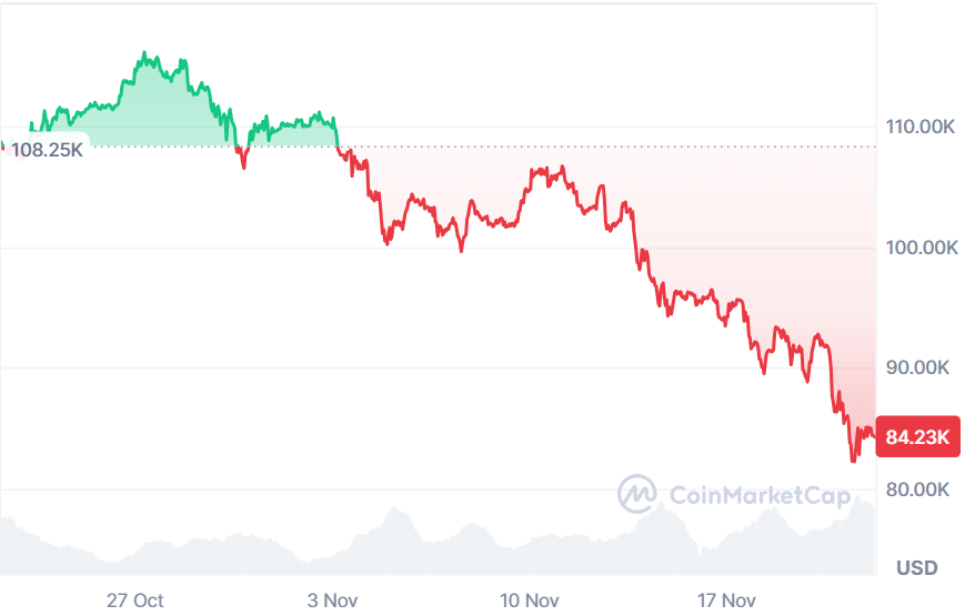 Bitcoin’s price downturn is significant, declining to $82K before recovering to $84K on November 21, according to CoinMarketCap.