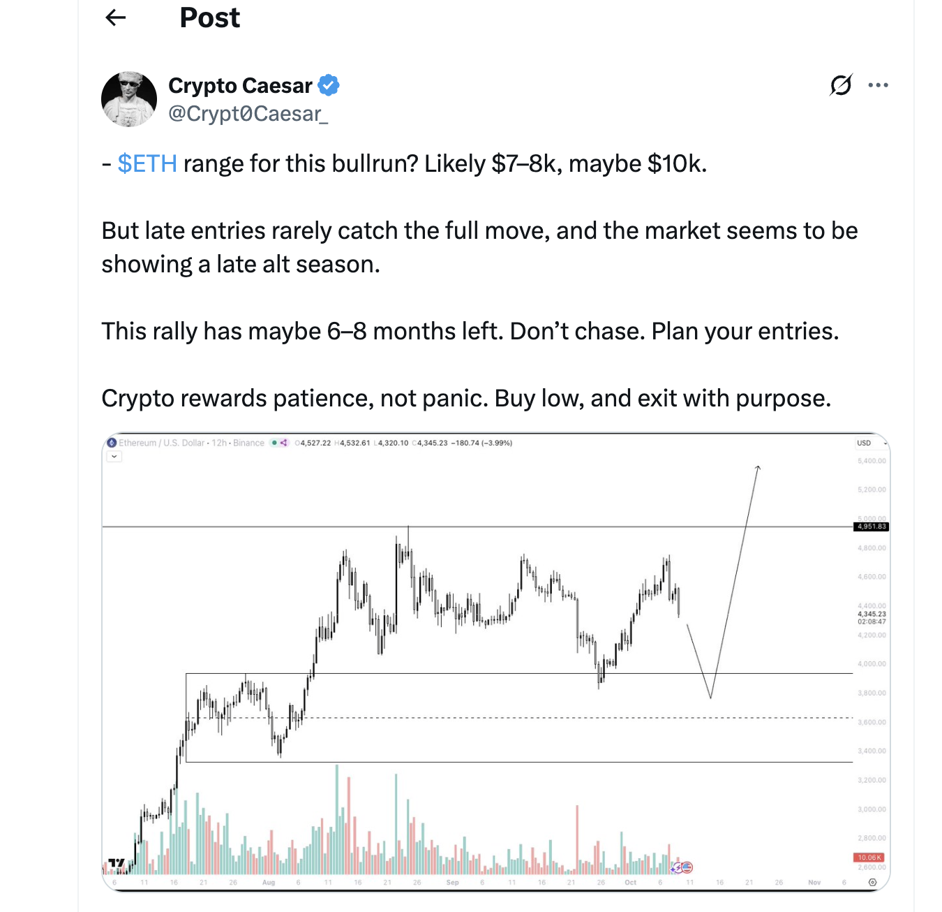Crypto analyst Crypto Caesar said a dip below $4,000 may serve as a final shakeout before ETH recovers. The Relative Strength Index (RSI) shows the market near oversold levels, suggesting that a rebound could follow.