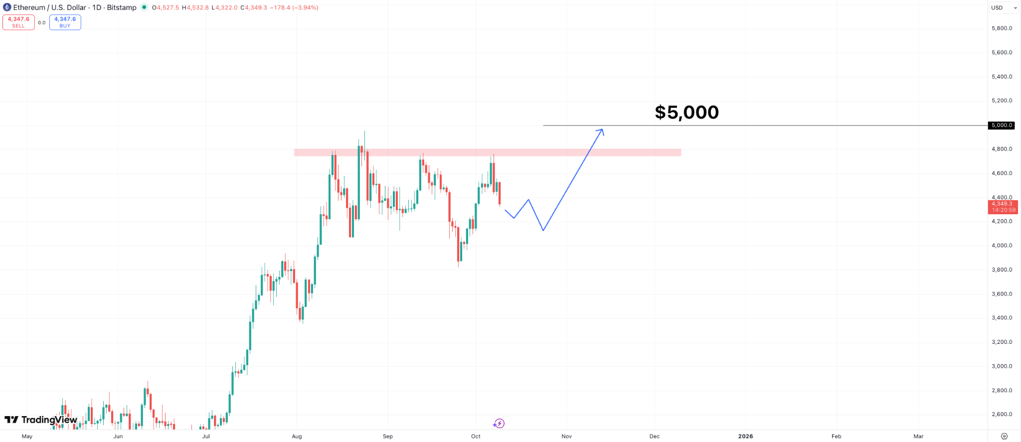 After months of volatility, Ethereum has found its footing. Right now, ETH is trading at $4,350, a 13% rally from its lows in late September. While the token’s price did pull back a bit from its peak on Tuesday, this is viewed as healthy profit-taking after such a quick rally.