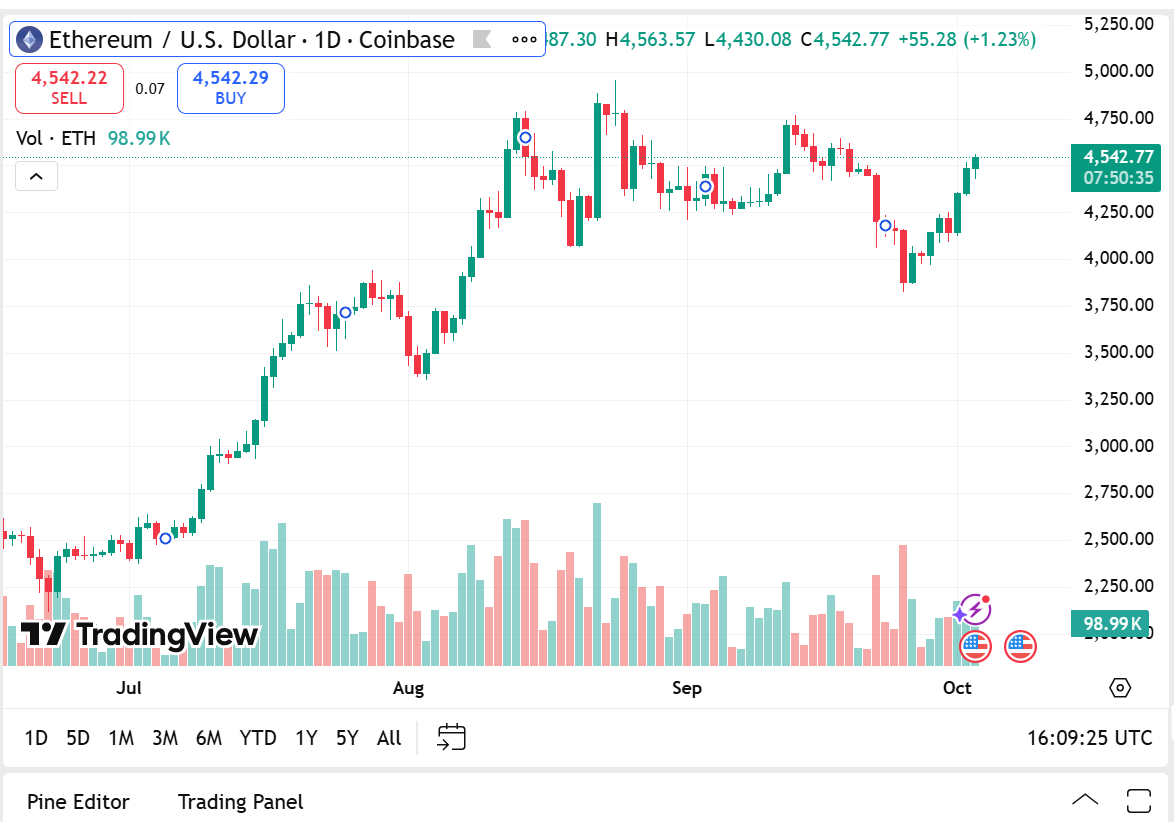 Ethereum continues to be strong as it still sustains its upward momentum in Q4 2025. As Ethereum’s price moves up to $4,542.22, being 2.23% higher over the last 24 hours, confidence in legacy smart contract platforms is still intact.