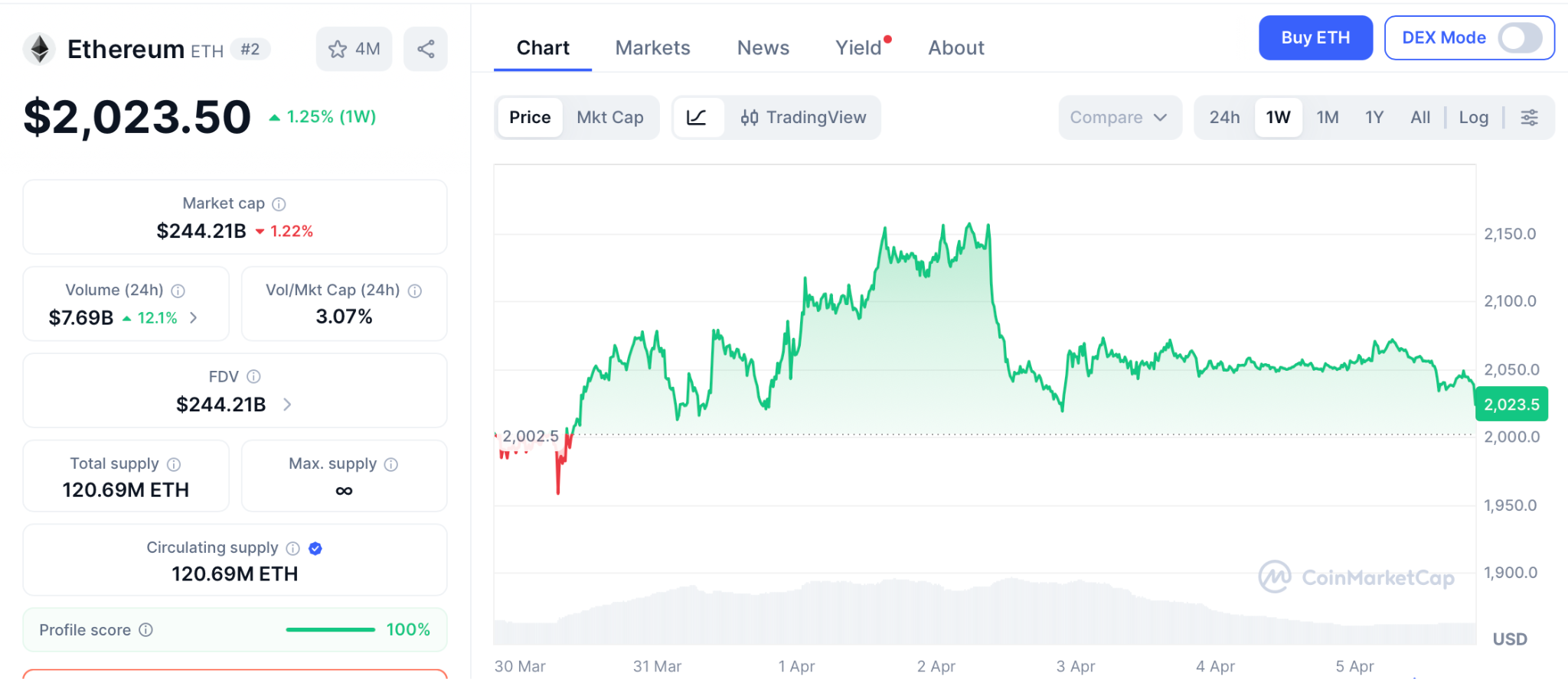 Ethereum trades at $2,023 on April 5, down 58% from its $4,953 August 2025 peak, per CoinMarketCap. The Fear and Greed Index reads 9.