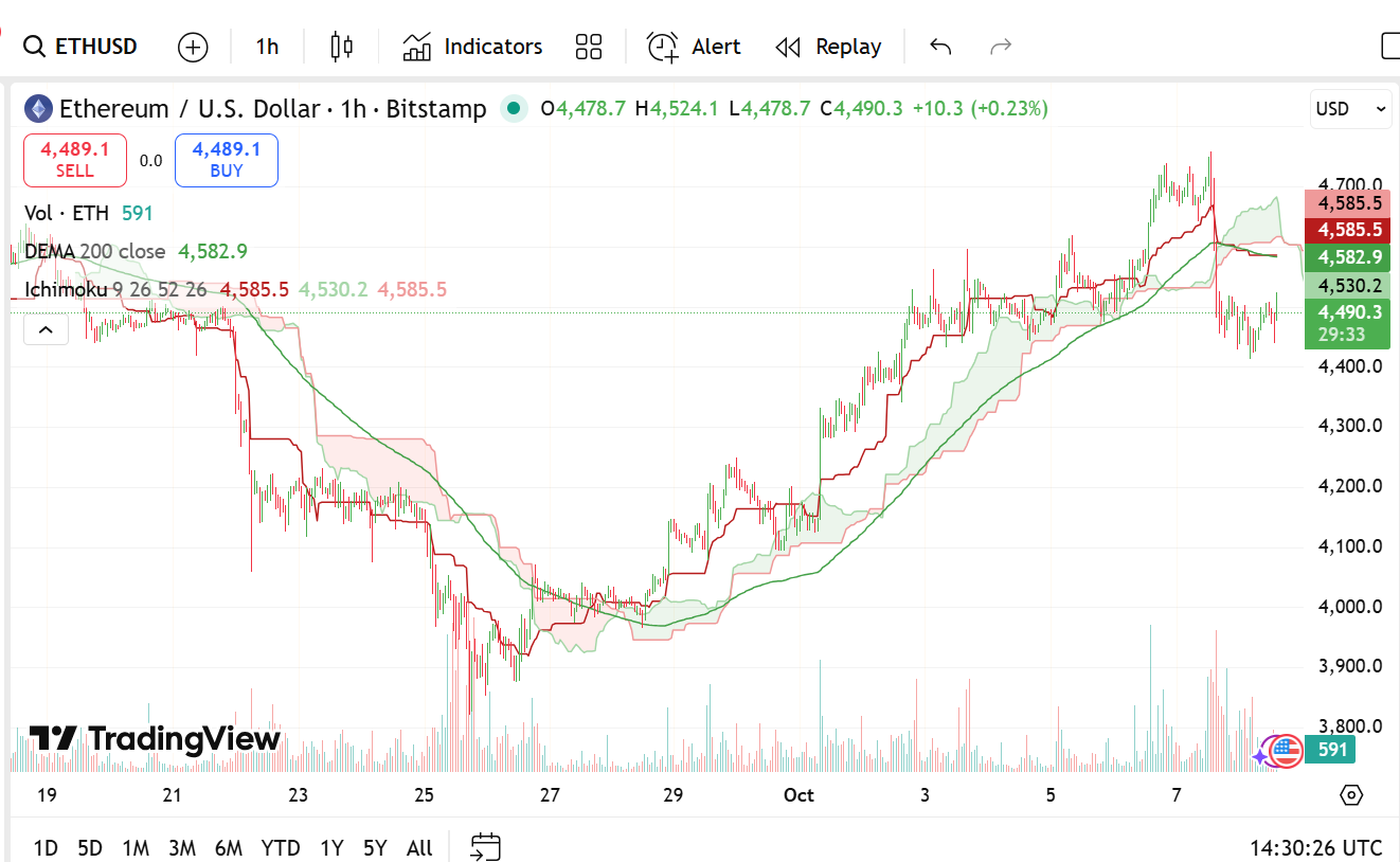 Ethereum price forecast has remained true to its word with ETH being able to withstand market volatility. Ethereum is currently trading at $4,491.05 and is down 4.44% in the last 24 hours.