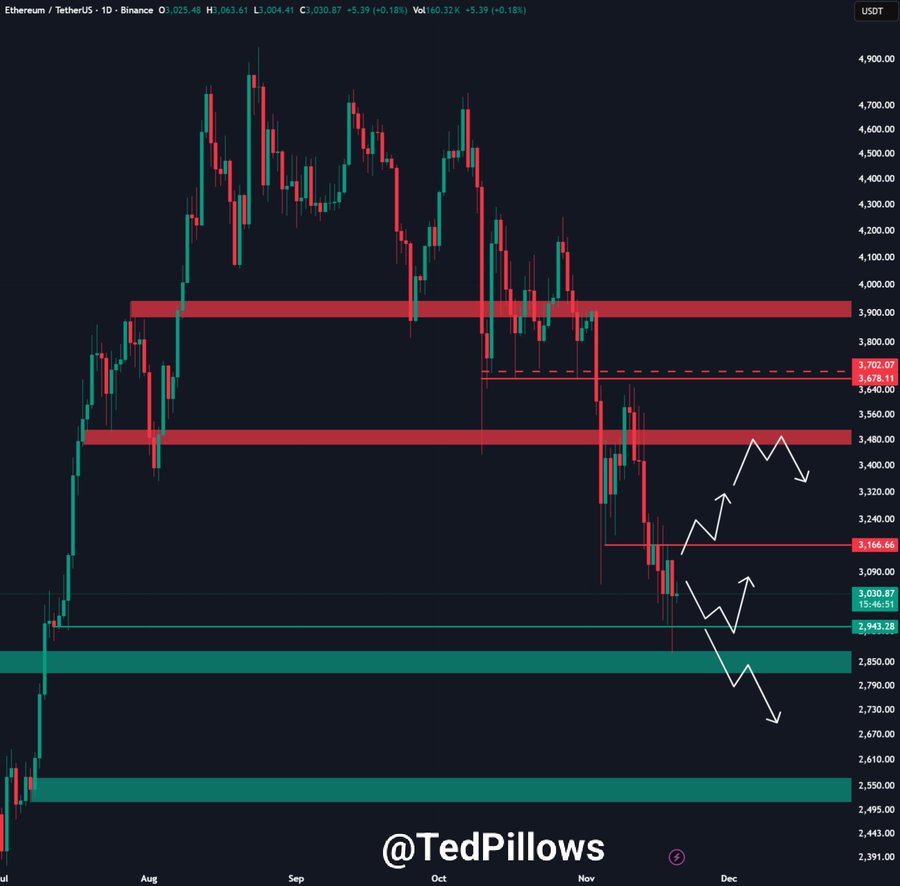 Analyst Ted Pillows noted on X that ETH dipped below $2,900 before quickly rebounding, warning that a failure to reclaim the $3,200 level could invite deeper losses toward $2,600 or even $2,100. However, a strong reclaim above $3,200 with volume could mark the start of a reversal.