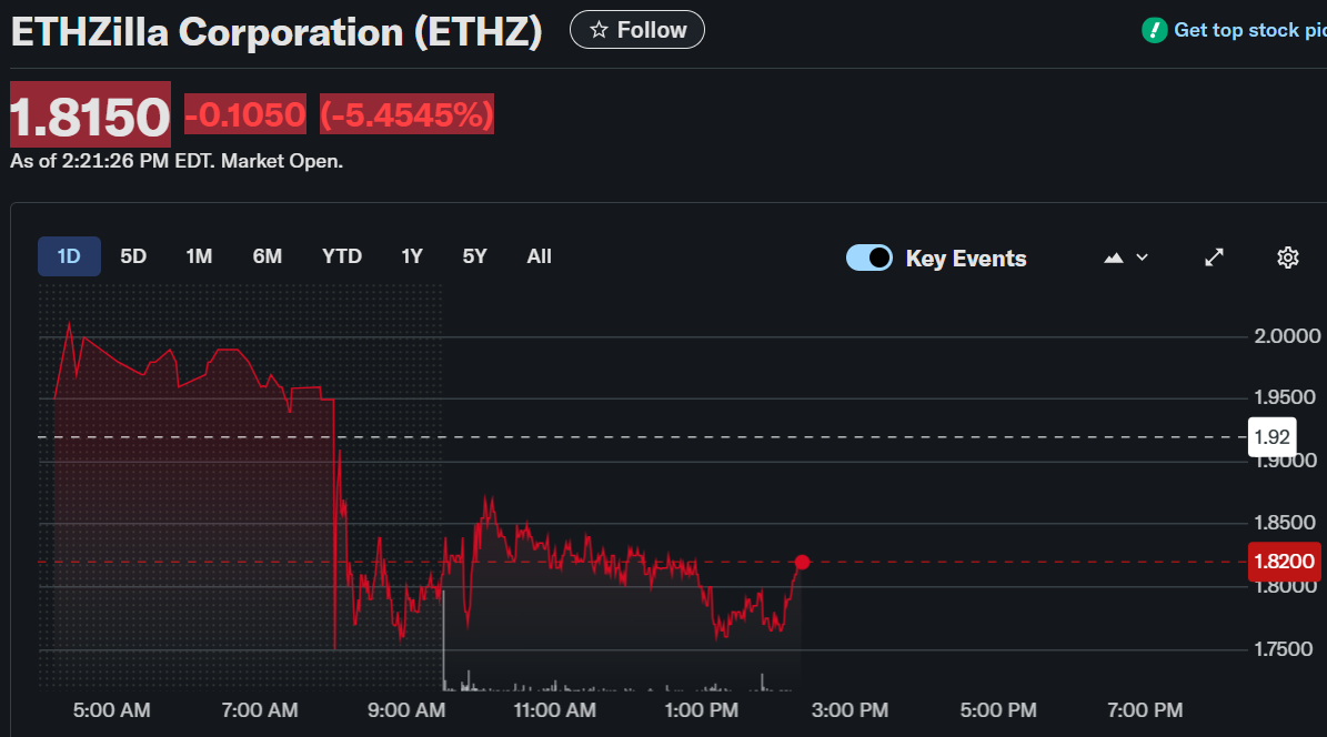 ETHZilla Corporation (NASDAQ: ETHZ) saw its stock fall sharply in early trading on October 15, 2025. The price dropped 5.45%, closing at $1.8150 amid heightened volatility. This decline came days before the company’s planned 1-for-10 reverse stock split.