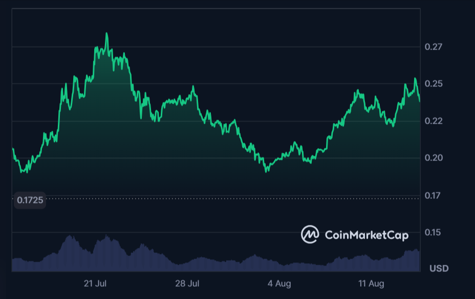 For traders starting with a small amount, DOGE is once again becoming a hot topic. At the time of writing, the Dogecoin price is holding around the $0.23 to $0.25 zone.