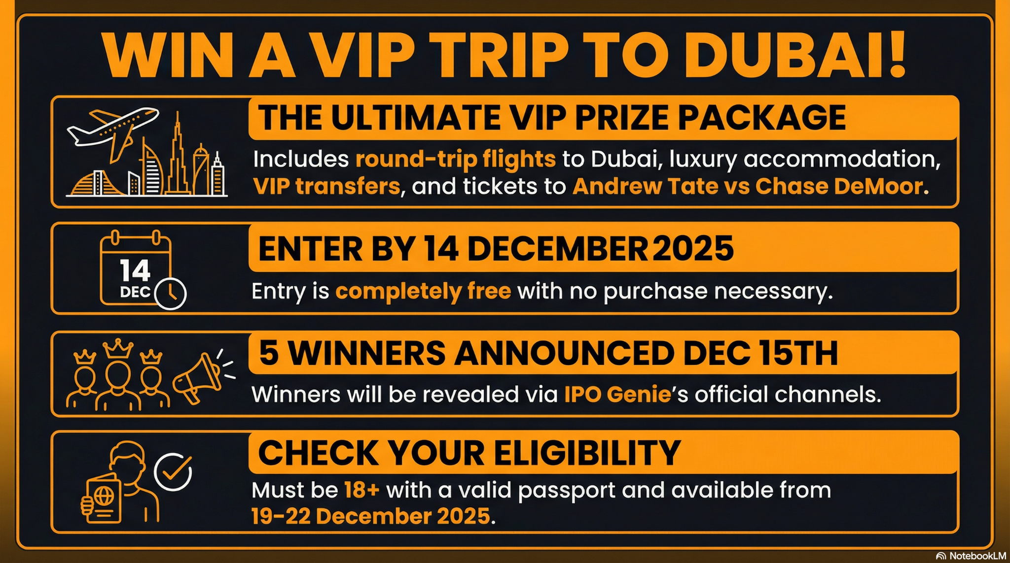 - Prize: Round-trip flights to Dubai, luxury accommodation, VIP transfers, live tickets to Andrew Tate vs Chase DeMoor, plus official IPO Genie apparel