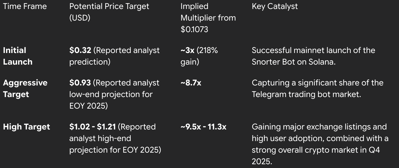 It states that reaching the lower target could be possible with just a smooth launch of the trading bot, while hitting the upper target would require “Gaining major exchange listings and high user adoption, combined with a strong overall crypto market in Q4 2025.”