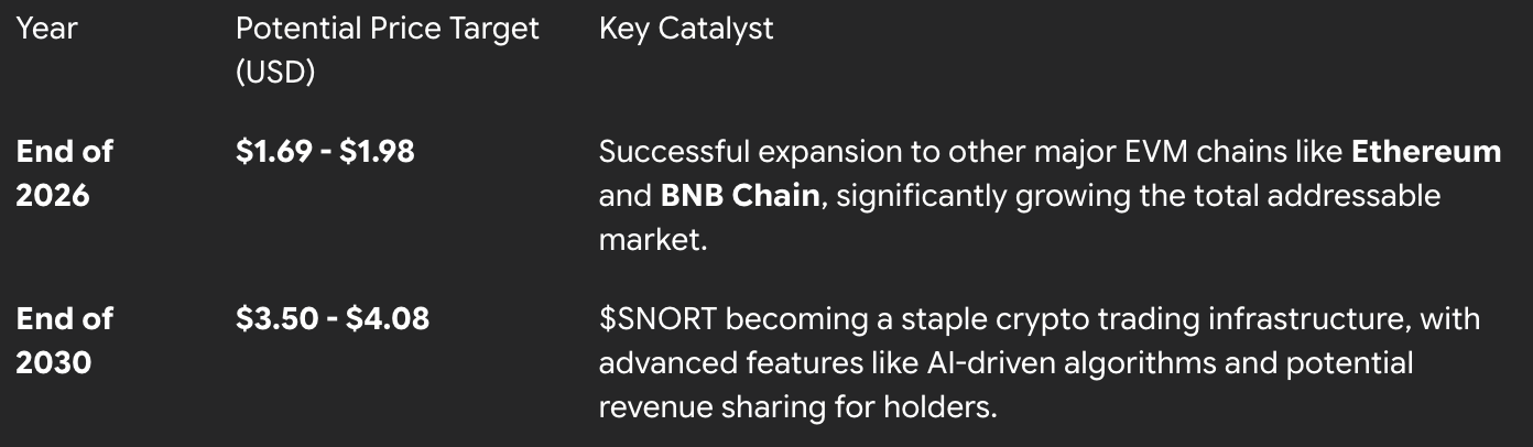 Looking further into the future, Gemini suggests that Snorter could reach potential highs of $4.08, representing a remarkable 3,674% gain from its current level. This would require “Snorter becoming a staple crypto trading infrastructure, with advanced features like AI-driven algorithms and potential revenue sharing for holders.”