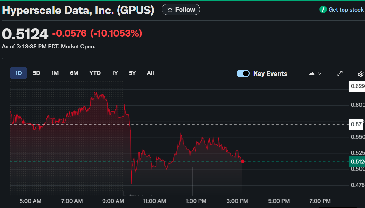 Hyperscale Data, Inc. (GPUS) shares fell sharply on Wednesday, declining approximately 10.1% intraday from around $0.57.