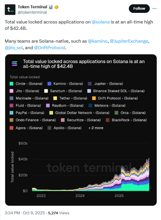 Solana has been one of the strongest blue-chip performers this cycle, thanks to its ultra-fast transactions and low fees that attract developers and investors. The most recent data shows the total value locked on the Solana blockchain reached a peak of $42.4 billion.
