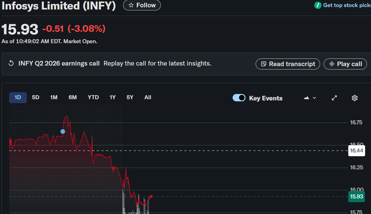 Infosys Limited (NYSE: INFY) stock traded at $15.85, down 3.56% as of 10:10 AM EDT, after releasing its second-quarter results for the period ended September 30, 2025.