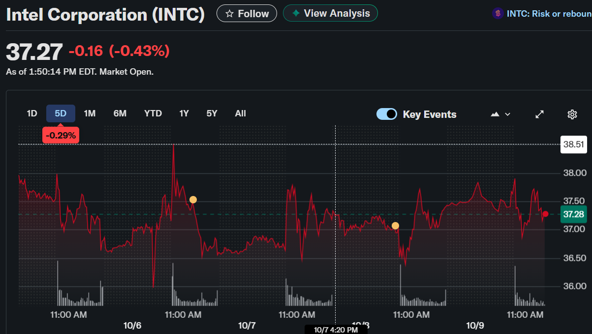 Despite brief midday spikes, the stock showed a downward trend throughout the session. The announcement centered around developments in Intel’s U.S.-based chip manufacturing strategy.
