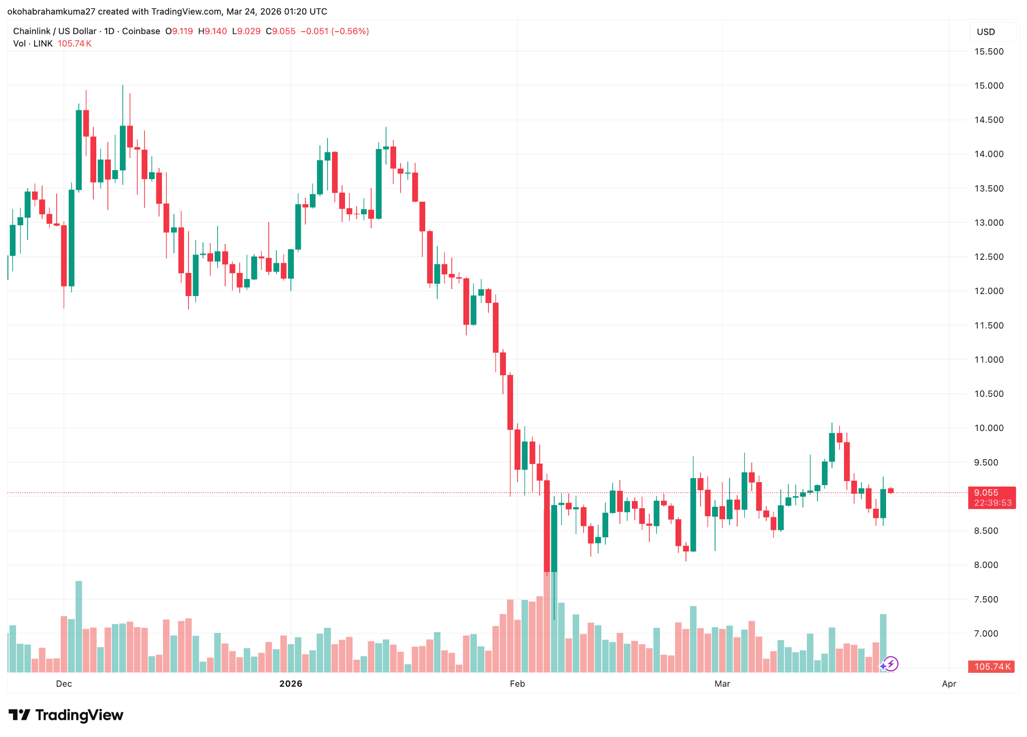 Chainlink fell 8% last week, as of March 23rd, underperforming the broader market with a neutral RSI of 43.31, sitting in bearish sentiment. For an oracle network that’s supposed to benefit from the same autonomous agent economy Stripe is building for, the price action is surprisingly weak.