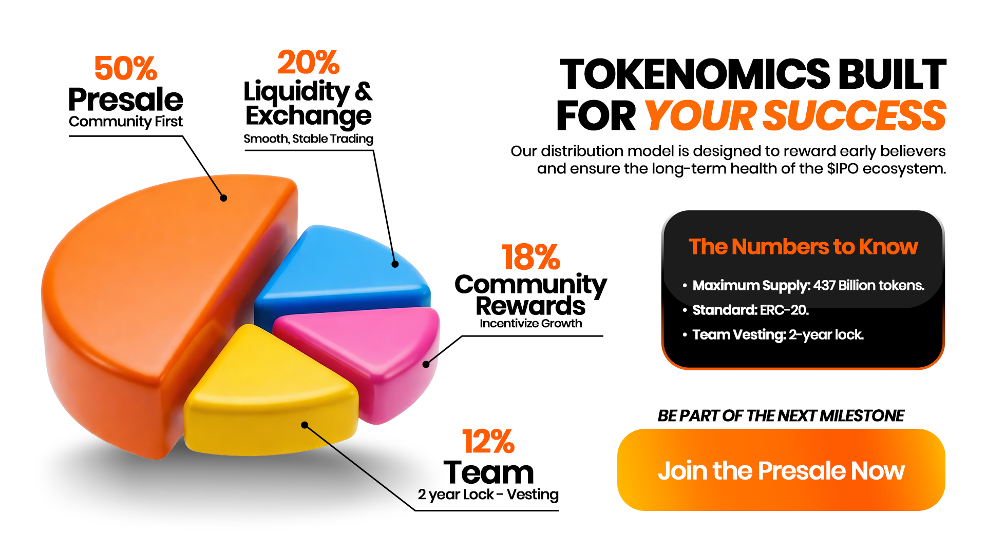 After the presale, $IPO tokens will be listed on decentralized exchanges (DEXs) and centralized exchanges (CEXs) as outlined in Phase 2 of the roadmap. 20% of the total token supply is reserved specifically for liquidity provision on these exchanges, ensuring you can trade your tokens on public markets.