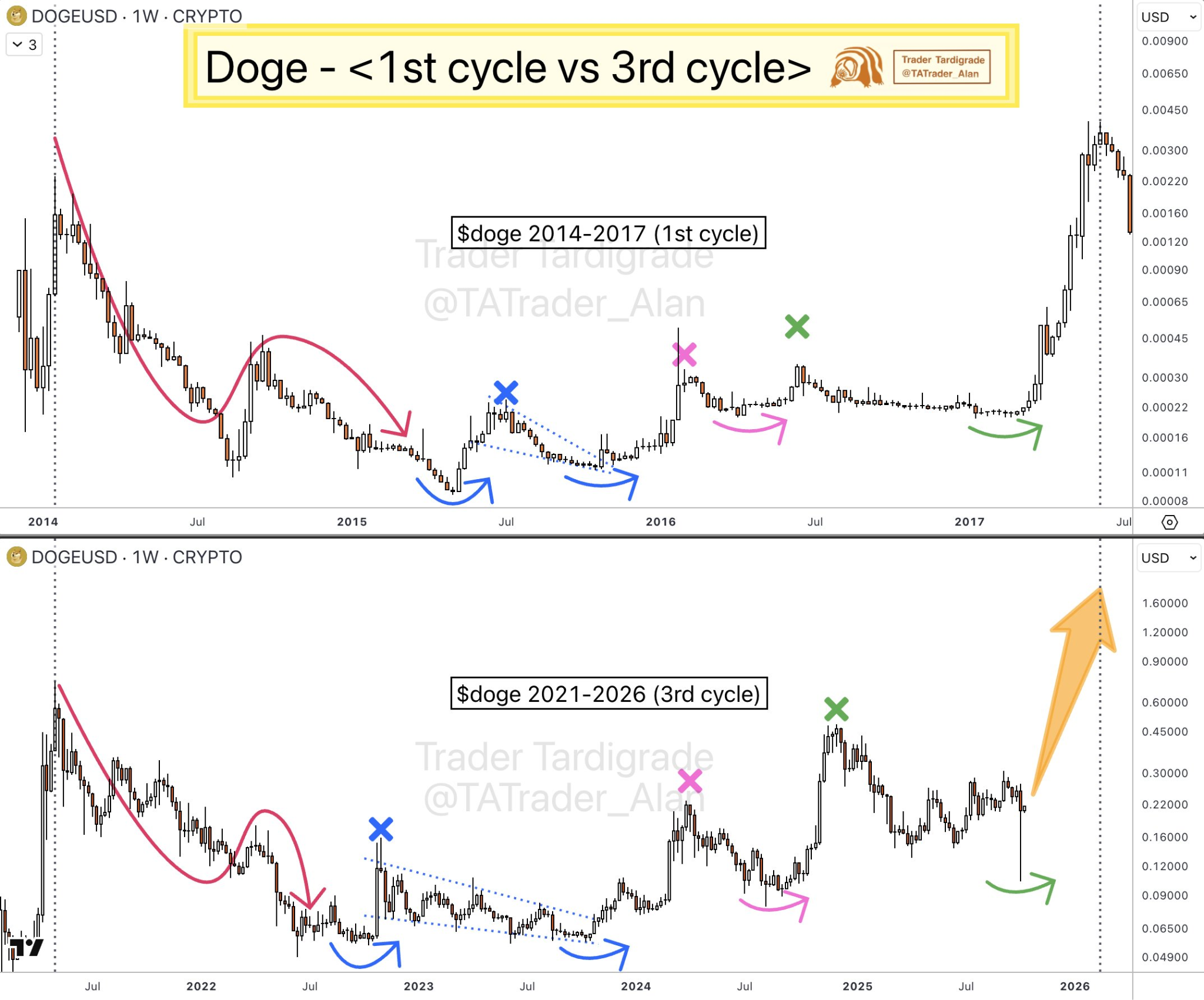 Meanwhile, analysts are watching Dogecoin (DOGE) closely as it mirrors price behavior seen before its past rallies. Market watcher Trader Tardigrade observed that DOGE is replicating the 2014–2017 accumulation pattern, which historically preceded a strong upward breakout.