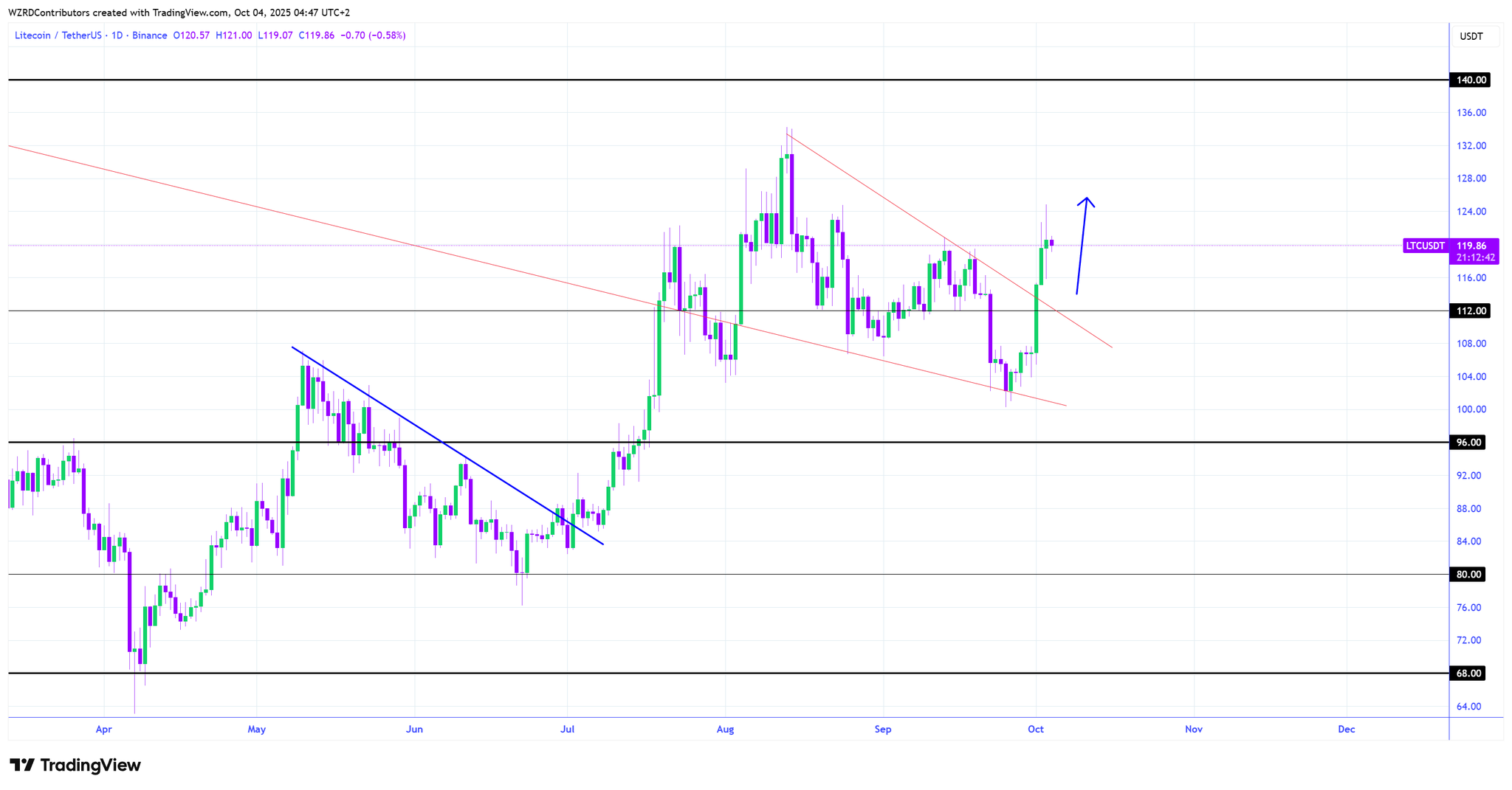 Litecoin (LTC) is attracting fresh market optimism as traders anticipate a potential breakout that could send the LTC price soaring in the coming months. Currently trading around $119.20, the Litecoin price today shows early signs of reversal within a bullish wedge pattern. Analysts tracking LTC news suggest that a confirmed breakout above the $140 resistance could trigger a rally toward $160 and eventually $250.
