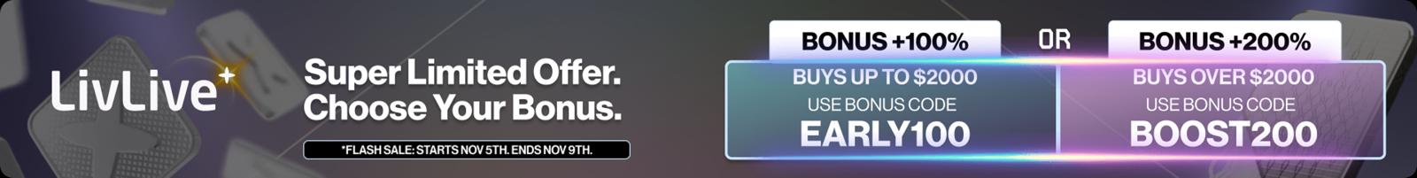 LivLive releases a high pressure bonus lineup designed for those aiming to maximize early positions. Entries under 2,000$ activate EARLY100 for a 100% bonus. Entries above 2,000$ unlock BOOST200 for a 200% multiplier. These immediate boosts position early movers ahead of the next stage jump.