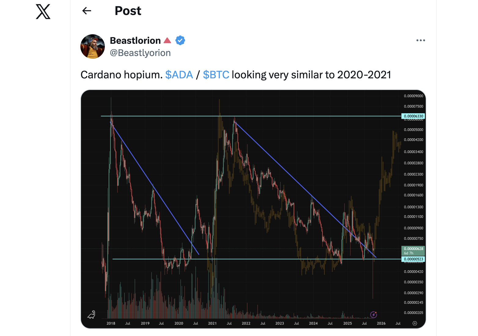 Cardano (ADA) has shown price behavior that looks similar to the 2020–2021 cycle, sparking fresh debate about its direction. Analysts point to the ADA/BTC chart, which suggests a potential rise if the trendline breakout continues.