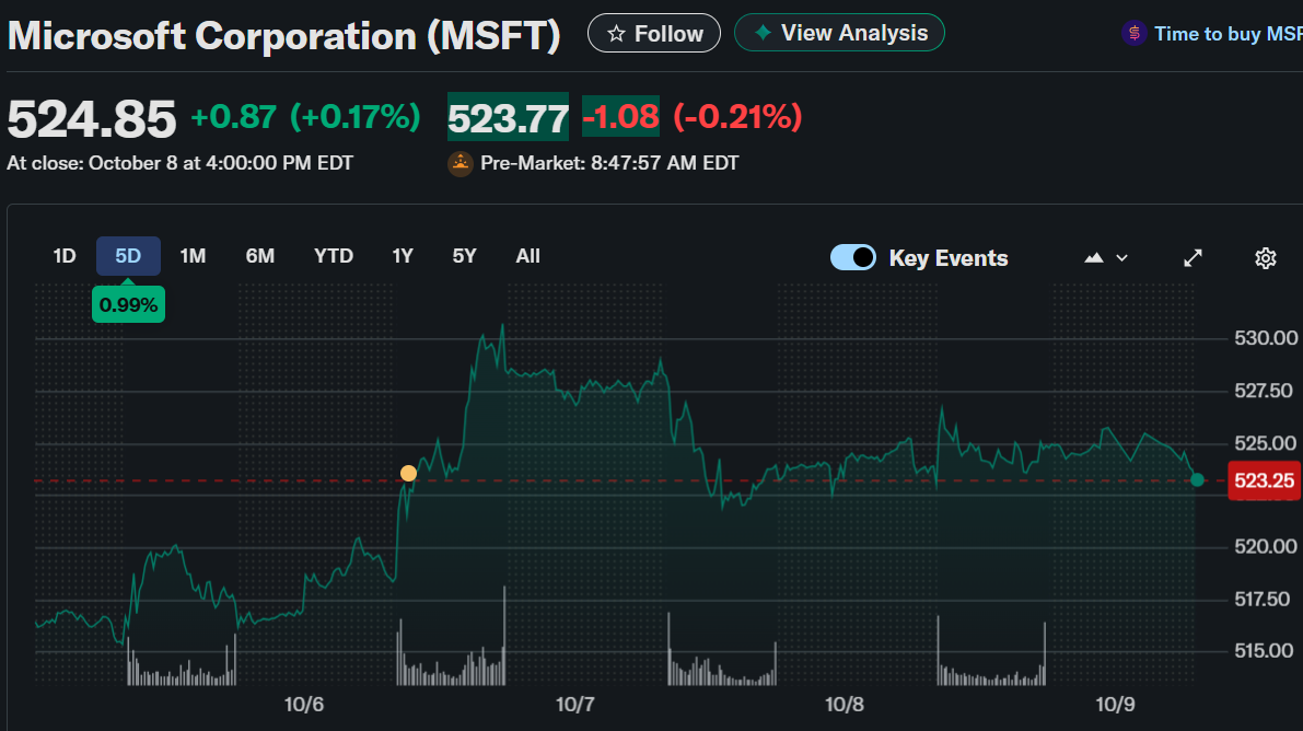 Microsoft Corporation shares closed at $524.85 on October 8, marking a 0.17% rise, but edged down in pre-market trading at $523.00.