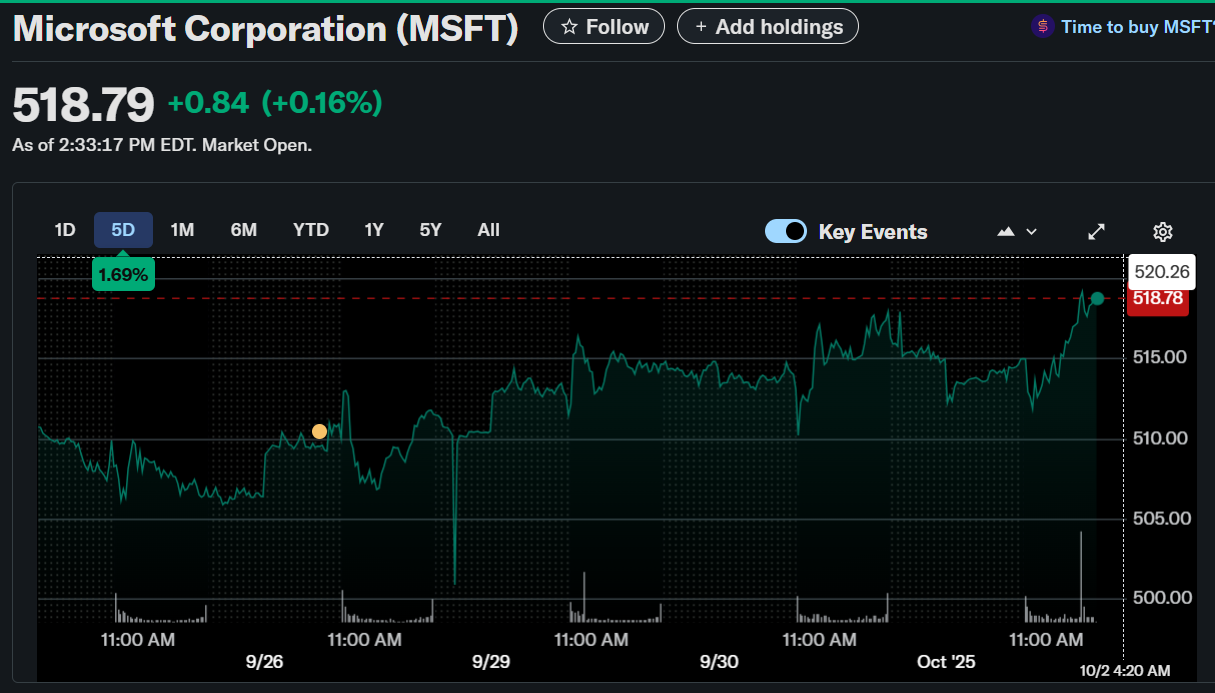 Microsoft (MSFT) shares surge slightly by market close Wednesday, ending at $518.82 after fluctuating throughout the trading session.