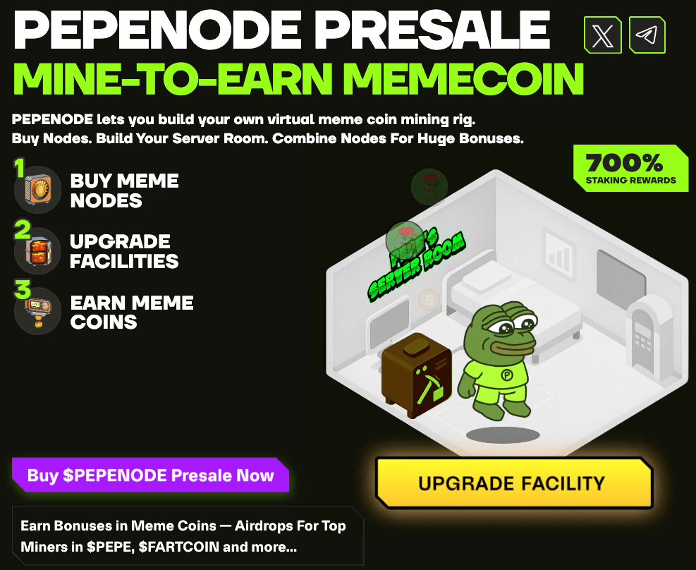 PEPENODE (PEPENODE) is mixing meme culture with a “Mine-to-Earn” system. Instead of relying on hype, it lets users run virtual mining nodes in their browser that simulate server activity – and generate passive crypto rewards.