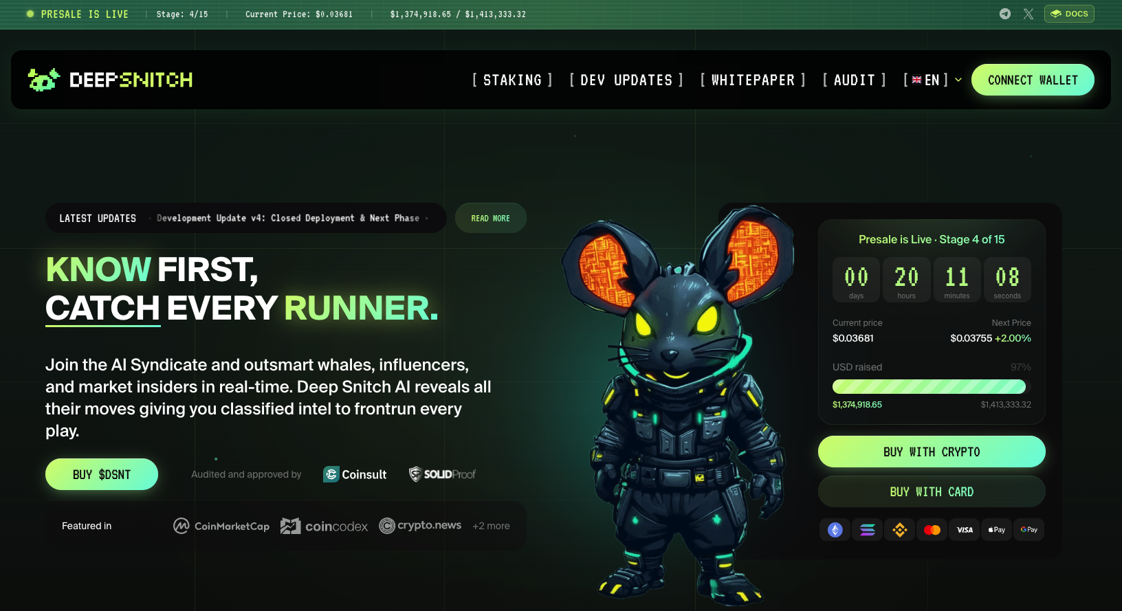 Visit the official DeepSnitch AI website, join Telegram, and follow on X for the latest updates.