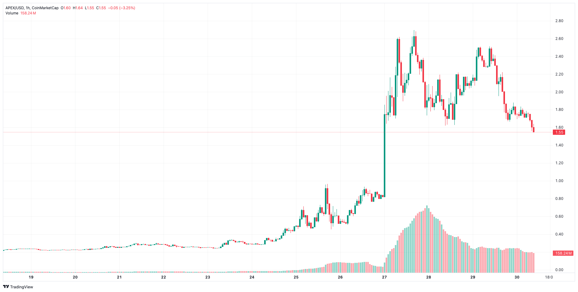 This has led to massive gains for the token in the market, with ApeX rising nearly 600% in the past week. However, the growth is showing signs of exhaustion. Technicals suggest the move may have pushed the token into overheated territory, with its RSI indicating a near-term cooldown. Analysts predict a decline of around 25% in the coming weeks.