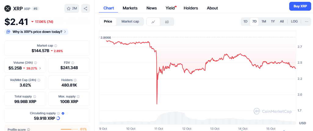 As of October 15, XRP’s value stands at $2.40 following a 17.23% fall over the past week. The 30-day XRP price chart also shows a 19.59% drop.