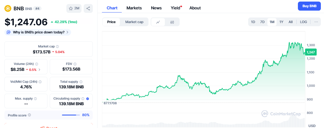 As of October 9, BNB’s value stood at $1,247 following a 20.14% increase in the past week. BNB’s 30-day price charts also show a 42.29% surge.