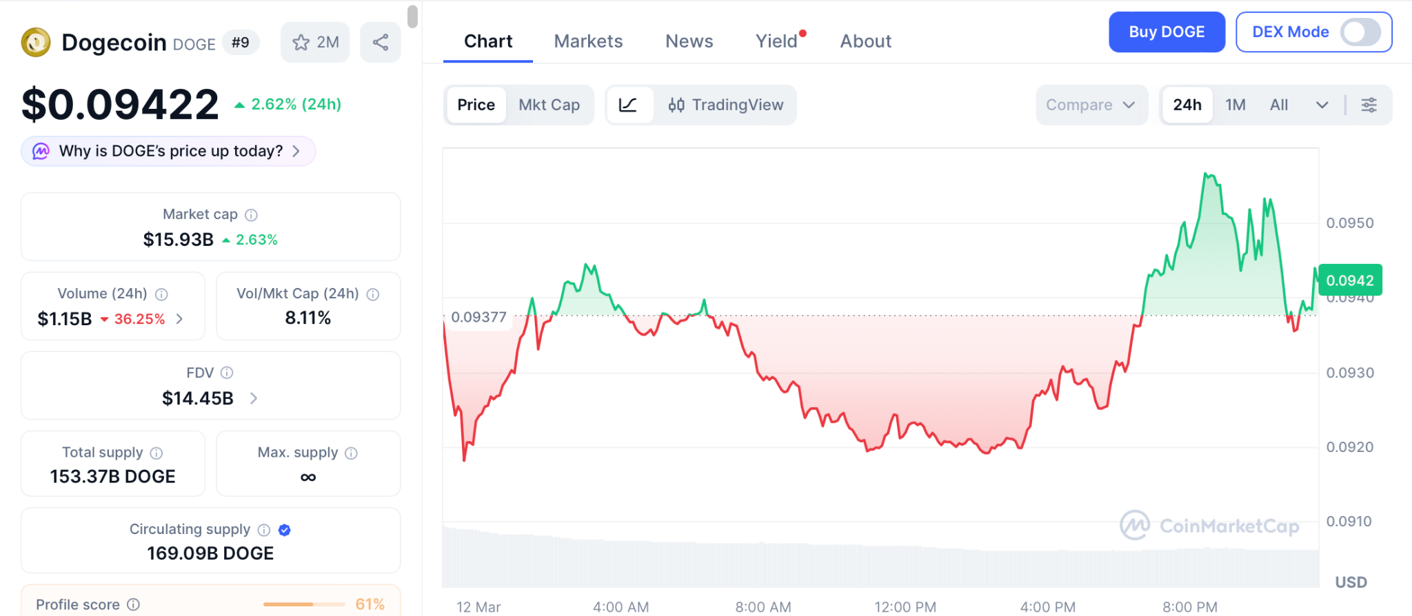 DOGE jumped 8% on the X Money announcement before fading back to $0.094 per CoinMarketCap. No crypto integration has been confirmed for X Money.