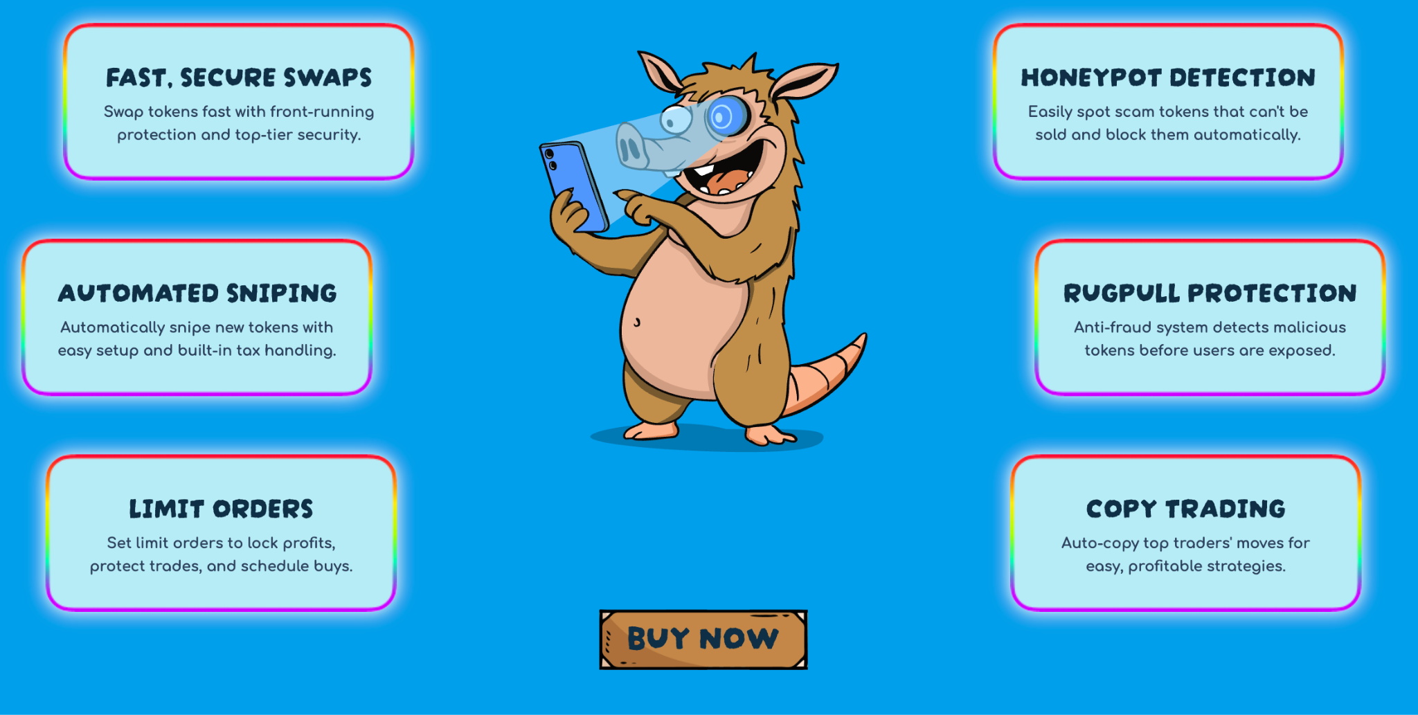 The project is developing a meme coin trading bot on the Solana blockchain, with plans to expand to EVM chains, including Ethereum, BSC, and Base, in the future. The bot aims to help users snag new meme coins with sub-second trade execution, while also protecting them from major risks, such as rug pulls and honeypots.