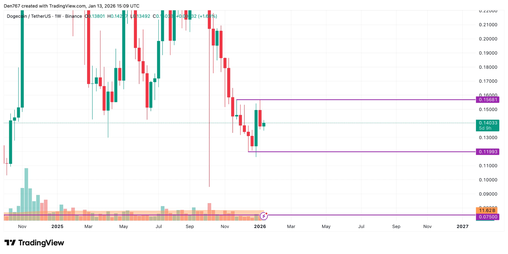On January 13th, Dogecoin was priced at around $0.14 after rising roughly 2.79% in 24 hours. Technical analysis indicates that DOGE is one of the trending market movers that could push toward $0.1450 if it holds its daily close.