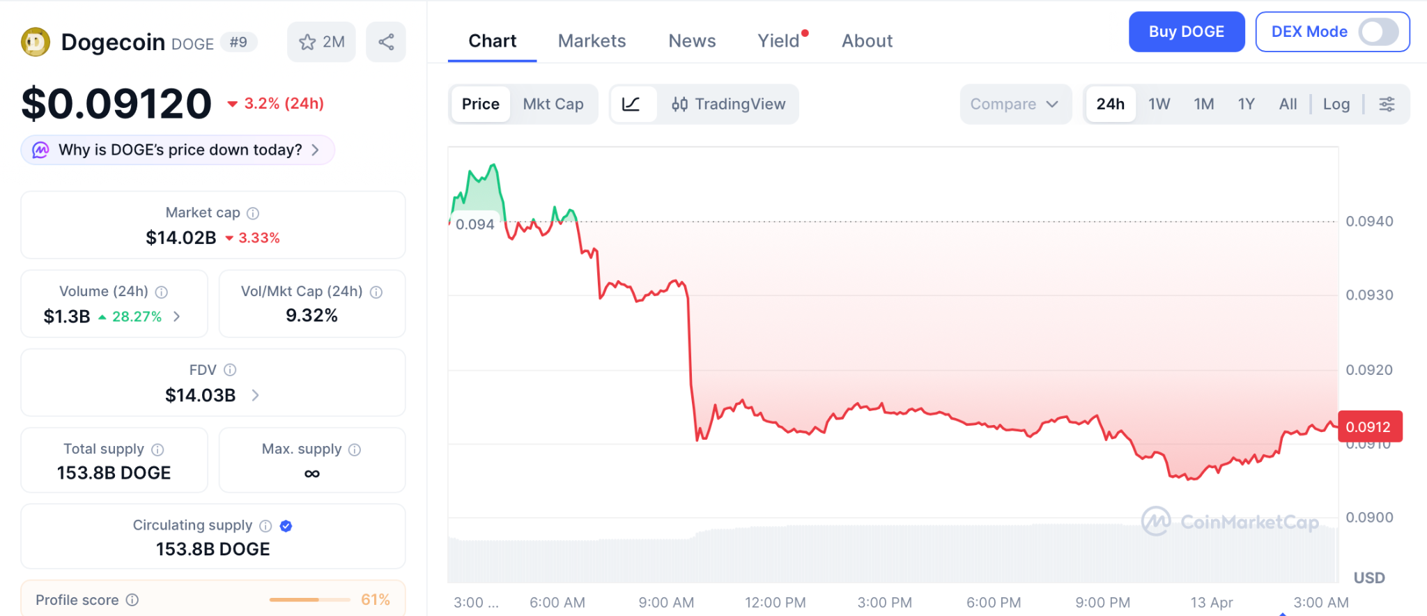 DOGE trades near $0.091 with a $14 billion cap, down 93% from its $0.73 all time high per CoinMarketCap.