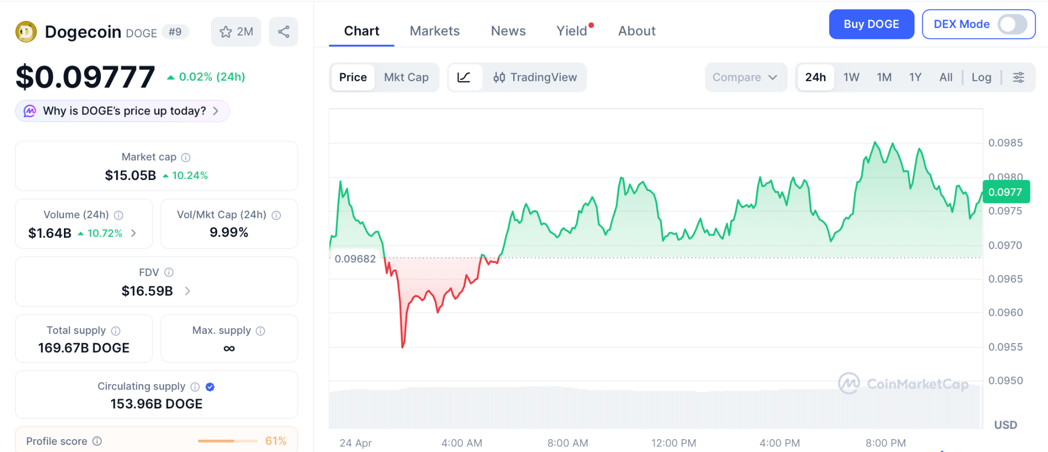 Dogecoin (DOGE) trades at $0.09777 per CoinMarketCap, up 2.30% after $330 million in whale accumulation over seven days and $800 million in volume on April 16. Support sits at $0.087 and resistance at $0.1028 with $0.1172 as the wedge target.