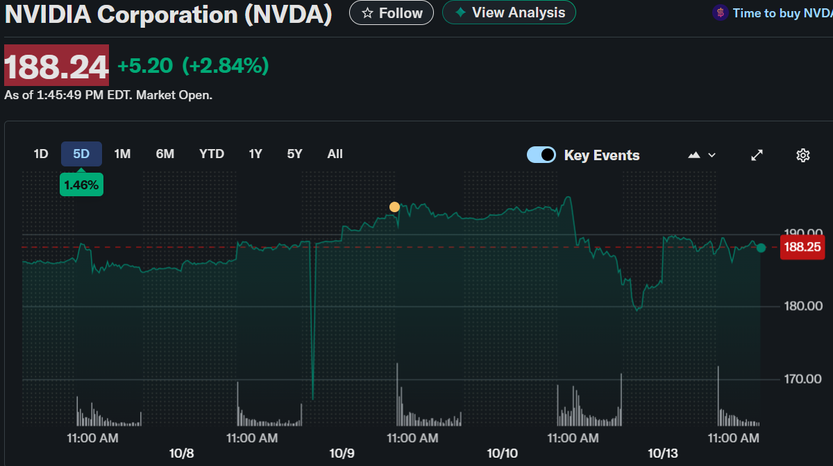 NVIDIA Corporation (NVDA) stock was trading at $188.40, up 2.92% as of October 13, 2025.