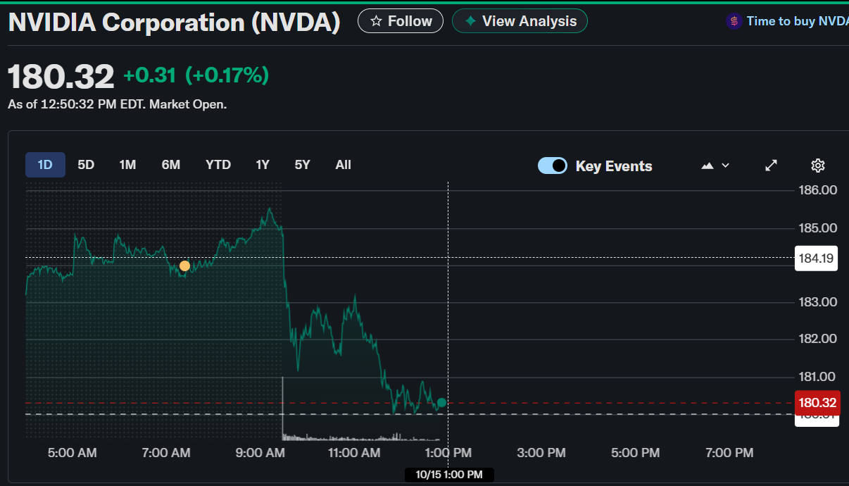 NVIDIA Corporation (NASDAQ: NVDA) moved steadily in early trading before peaking around $184.19 shortly after market open. Despite a pullback to $180.32 by early afternoon, the stock closed the day with a marginal 0.17% gain. The activity coincided with news of a major acquisition involving NVIDIA and other industry leaders.